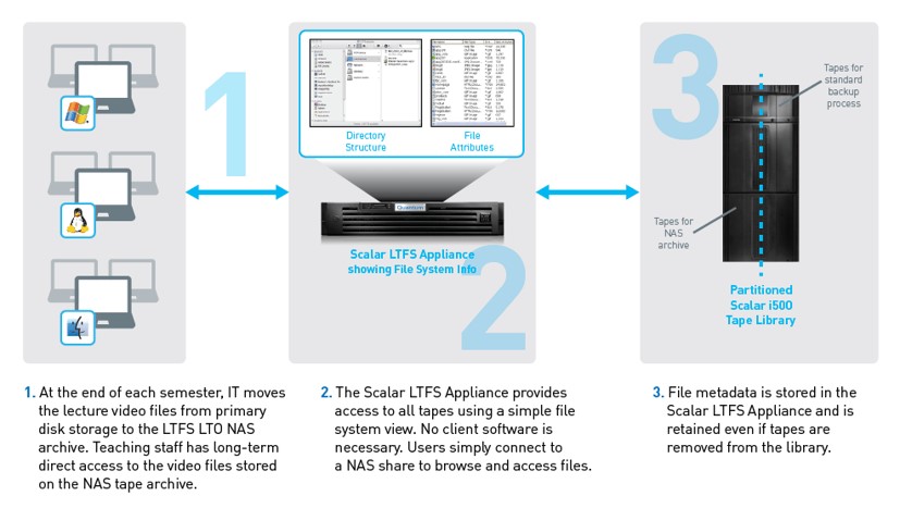 Scalar LTFS는 라이브러리 파티션의 테이프를 하나의 NAS 공유 환경으로 구현합니다.