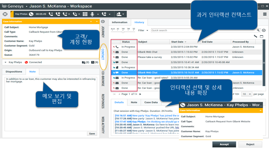 상담사가 전화, 비디오, 이메일, 채팅, SMS, 화면공유, 트위터, 페이스북, 업무 할당 등 모든 종류의 채널을 처리할 수 있는 통합 상담 애플리케이션입니다. 고객 여정 대시보드, 지식관리 등 다른 Genesys 솔루션에 대한 통합 뷰를 추가 할 수 있으며 타사 CRM과 안정적이고 효율적인 연동을 지원합니다.